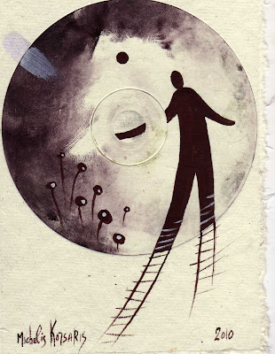 Στις φωτογραφίες, η πρόσκληση της Έκθεσης και το χαρακτικό έργο - συμμετοχή του Μιχάλη Κότσαρη.